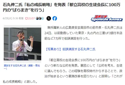 石丸氏が新たな公約「生徒会長に100万円配る」謎の権力を持った生徒会が爆誕か