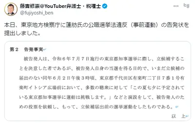 【速報】東京地方検察庁に蓮舫氏の公職選挙法違反(事前運動)の告発状を提出された模様