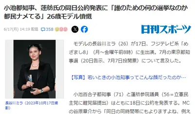 人気モデル、小池都知事、蓮舫氏の同日公約発表に「やめません?そういうの。誰のための何の選挙なのか。都民ナメてる」