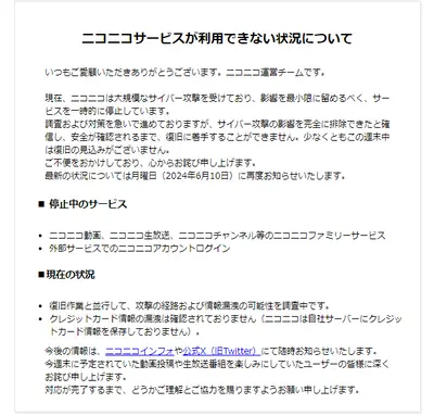 【速報】ニコニコ動画、大規模サイバー攻撃を発表「少なくともこの週末中は復旧の見込みがございません」