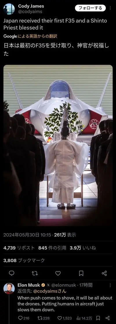 イーロンマスクさん、今時F35戦闘機を受け取りはしゃいでる日本をディスるwwwwwwww