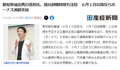 蓮舫のボーナス考察で5ch盛り上がる「今日提出も事務処理で6月1日なってしまうとか」「『離党する”方向”です』だから」「6/1は土曜日だから月曜日にとか泥沼の展開」