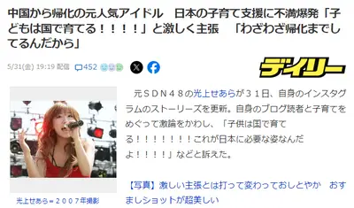 中国から帰化の元SDN48光上せあら 日本の子育て支援に不満爆発「わざわざ帰化までしてるんだから」