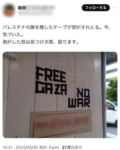 麺屋「NO WARを訴えるパレスチナの旗を模したテープが剥がされとる。剥がした奴は見つけ次第、殴ります」NO WARも結局暴力ですか