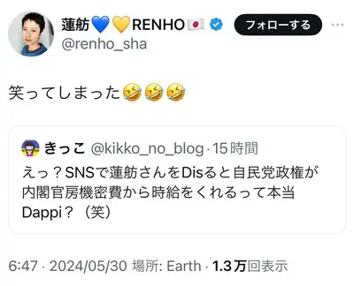 【速報】蓮舫本人「笑ってしまった」が悪質デマに飛びつき引用リツイート「SNSで蓮舫Disすると自民党から時給」、これが都知事になる可能性