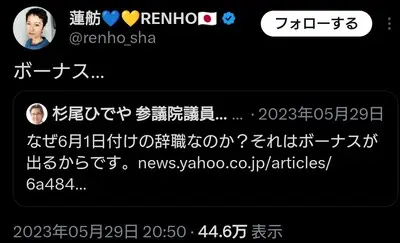 【速報】蓮舫さんは、6月1日時点で在職の議員が貰えるボーナス310万円待ちしてないよね?過去に受取辞職した議員を猛批判