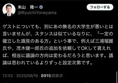 【悲報】米山隆一、Xで夫婦喧嘩wwww