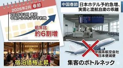 【悲報】26年春節ホテル予約、中国発は前年を約6割上回る見込み 渡航自粛でも個人客伸びる