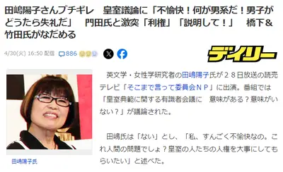 田嶋陽子「皇室議論?不愉快!何が男系だ!男子がどうたら失礼だ」