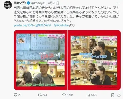 大衆酒場店主・黒かどや「日本語を喋る努力をしろ。無理なら通訳を」、パヨ猛攻撃にお詫びと休業のお知らせ※そもそも定休日なので煽りww