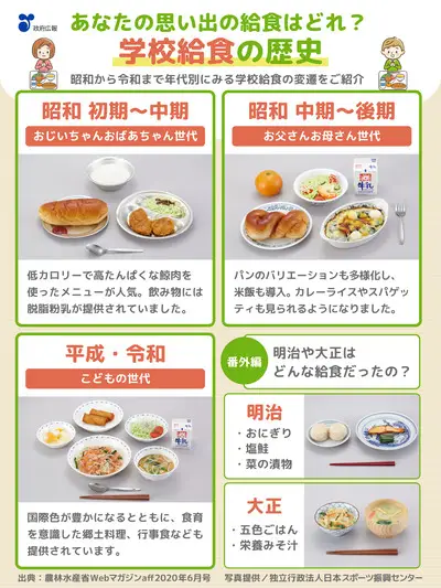 【画像】政府広報オンラインが紹介した【平成・令和の給食メニュー】に保護者達から総ツッコミ「先週の給食これだけど...(;_;)」
