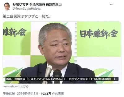 【速報】立憲民主党の杉尾秀哉参院議員「第2自民党の維新、ヤクザ(暴力団)と同じ」