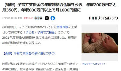 「子無し税」の月額料金が発表、年収200万円=350円、年収600万円=1000円、年収1000万=1650円