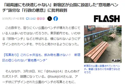 パ「新宿区が設置した意地悪ベンチ!ホームレス排除のふりした住民ーの嫌がらせ!」→新宿区長「ホームレス対策でもないし、近隣住民の要望であり地元からの苦情はありません」