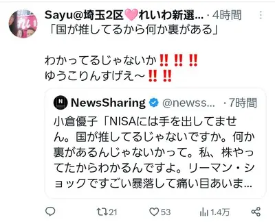 【速報】小倉優子「NISAは国が推してるから裏がある」れいわ支持者が絶賛→「やっぱ見直したした!iDeCo開始!オルカンとS&P500に投資!」