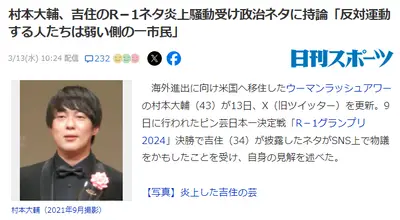 【吉住R1デモネタ騒動】SNS「パヨは同じ政治ネタのウーマン村本は絶賛するクセに」ウーマン村本が降臨、弱い側の市民とか言い出すwww