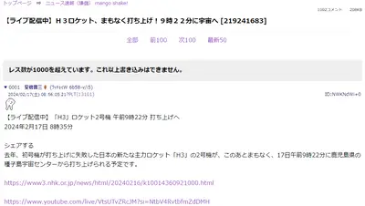 【悲報】コスト半減達成のH3ロケット打ち上げ成功が受け入れられない模様「茶番。宇宙は存在しない」