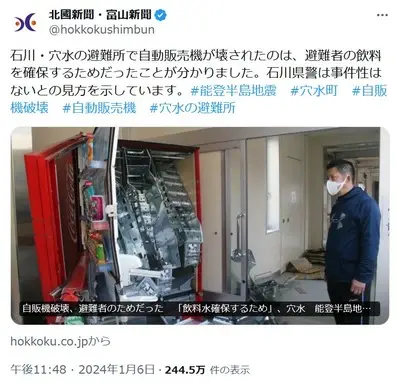 【速報】避難所の自販機破壊、相当悪質な犯行か 鍵は事務所に保管され、学校関係者なら壊さず開錠可能