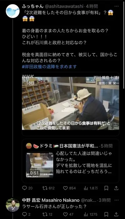 【NHK密着】2次避難でまた誤解を生む話題「ラサールが正しかった」が拡散 被災者「食事が有料だと!」→政府説明「ご提供する食事以外は自己負担」