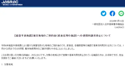 日本音楽著作権協会(JASRAC)「被災地の皆様へ、3か月後からは著作物使用料の請求に伺いますヨロ」
