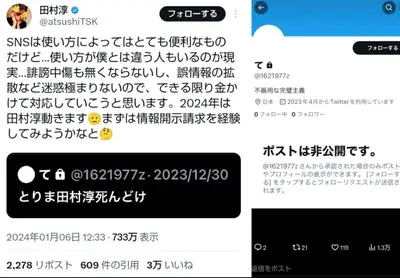 田村淳「2024年は動きます、まずは開示経験かな」→ペタッ「誹謗中傷スクショ」←5ch「鍵垢0フォロワー?なんで見えるの?」