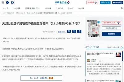 沖縄タイムスが能登半島地震の義援金を募集 ※現金直接持参or現金書留のみ受付