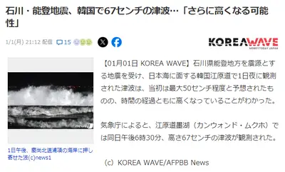 【令和6年能登半島地震】韓国で67cmの津波が発生 5ch「天文学的賠償請求か?」「はい謝罪要求」