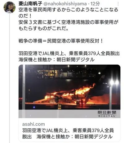 リベラル「海保機衝突、空港を軍民両用するからこうなるのだ!民間空港の軍事使用反対!」→炎上し削除