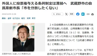 【朗報】武蔵野市の自民系新市長「公約通り外国人に投票権与える条例制定は凍結する」