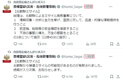 【悲報】北朝鮮ミサイル発射 自民党は複数注意喚起RT 立憲「私だけが知っている健太さん」