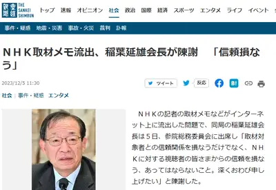 NHK取材メモのネット流出問題、最終段階にまで問題が発展 NHK稲葉会長が登場へ