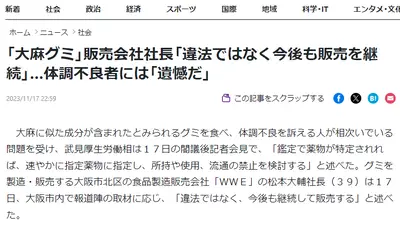 【速報】社長「大麻グミは違法じゃない販売続ける」検査結果が判明→厚労省「合成化合物が検出された、今すぐ規制する」指定薬物に追加
