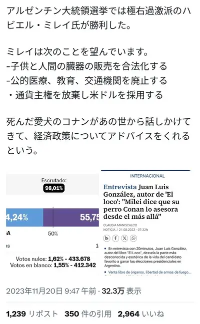 【速報】アルゼンチン「税金9割廃止、社会保障廃止、公共事業・医療・交通廃止」亡くなった愛犬から助言が届く模様と主張