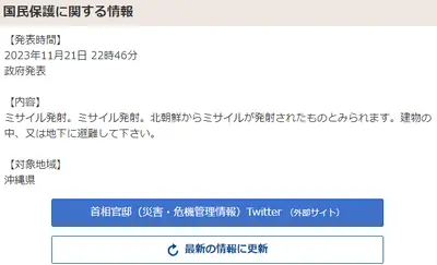 ■Jアラート発出■ 北朝鮮からミサイルが発射。建物の中、又は地下に避難を