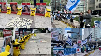 【悲報】イスラエル大使館さん拘束された大量のピカチュウを並べ、ガザの人質解放を訴える