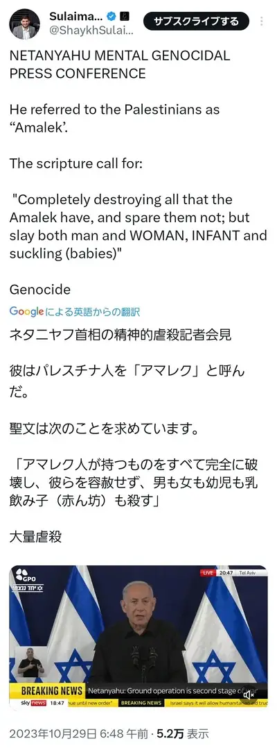 【悲報】ネタニヤフ首相、会見「聖書にこう書いとる、パレスチナ人が持つもの全て破壊し、容赦なく男も女も赤ん坊も●せってな」