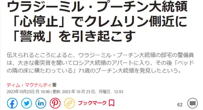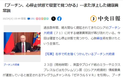 【速報】プーチン大統領の心停止状態、Yahooニュースにも登場「官邸内の特別集中治療室で意識を取り戻して現在は安定」