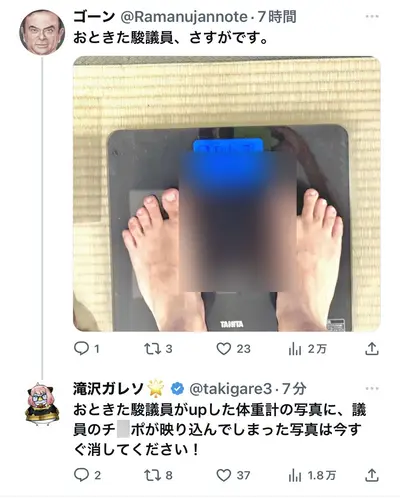 【悲報】維新の音喜多駿さん 体重計に乗る画像にご立派な陰部が映り込んでしまい謝罪「あかん、しばらく発信やめた方がいいわコレ」
