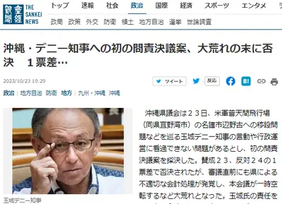 【速報】沖縄・デニー知事への初の問責決議案、1票差で・・・否決!