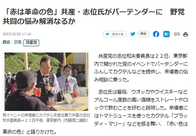 【悲報】共産党の志位氏、バーテンダーになり飲み物提供「赤い色は革命の色」悩み相談の若い女性に助言「『私、モヤモヤしているんだけど』っていいな」
