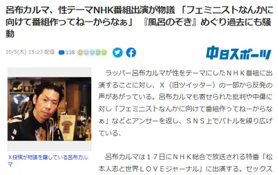 「男子は風呂のぞきたがる」発言の呂布カルマ、NHK出演で炎上→「フェミ向けに番組作ってないしな」と挑発