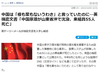 【英国機密文書】中国の原潜が西側の潜水艦を確保するため設置した障害物に自ら衝突し酸素システムが故障したため50人以上の乗組員死亡