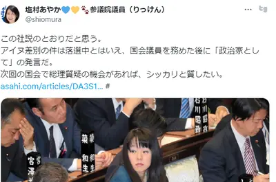 立憲民主党・塩村あやか議員「次回の国会で総理質疑の機会があれば、杉田水脈の発言をさらに追及したい」