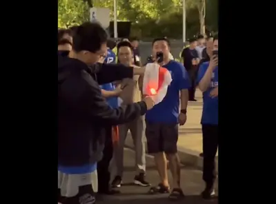 【動画】日本・浦和レッズが中国でサッカーの試合→スタジアムの外で日の丸に火をつけ合唱、これが中国人
