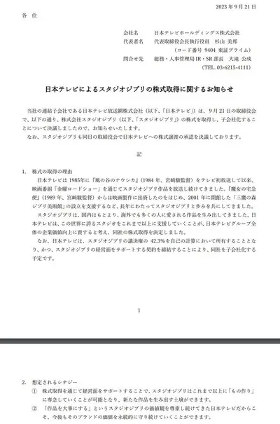 【速報】日本テレビ、スタジオジブリを買収 日本テレビの株価がストップ高(時間外)
