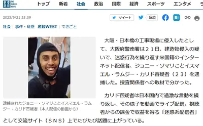 【速報】大阪府警、反日YouTuberのジョニー・ソマリ逮捕 建造物侵入の疑い