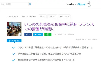 【日本も必要?】警察がいじめ加害者を授業中に逮捕 保護者から怒りの声 仏政府「子どもたちを守る手段だ」