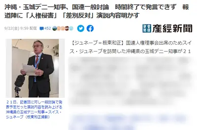 【速報】玉城デニー「米国基地があああ!ああああ!うわあああああ!!」 国連「はーい時間ですお帰り下さい」時間終了で発言できず、記者に向かって演説する