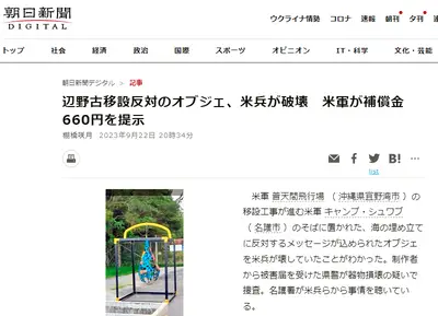 【沖縄】辺野古移設反対のオブジェ、米兵が破壊「敷地内なので撤去は必要だが壊したのは謝罪する」補償金660円を提示