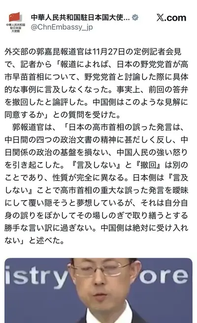 【デマ】中共駐日大使がXに報道官のコメ掲載「日本では台湾同胞を含む観光客襲撃事件が相次いで発生!台湾人も襲われます!」